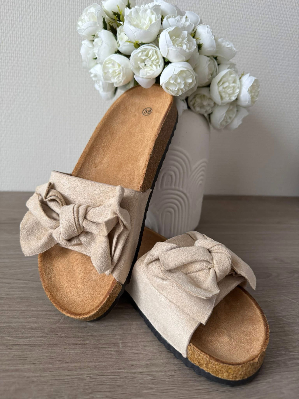 Divatos és nőies megjelenésű papucs puha, velúr hatású felsőrésszel és látványos masni díszítéssel. Kényelmes, enyhén formázott talpa biztos tartást nyújt a mindennapi viselet során. Tökéletes választás nyári szettekhez, akár ruhával, akár farmerrel kombinálva.