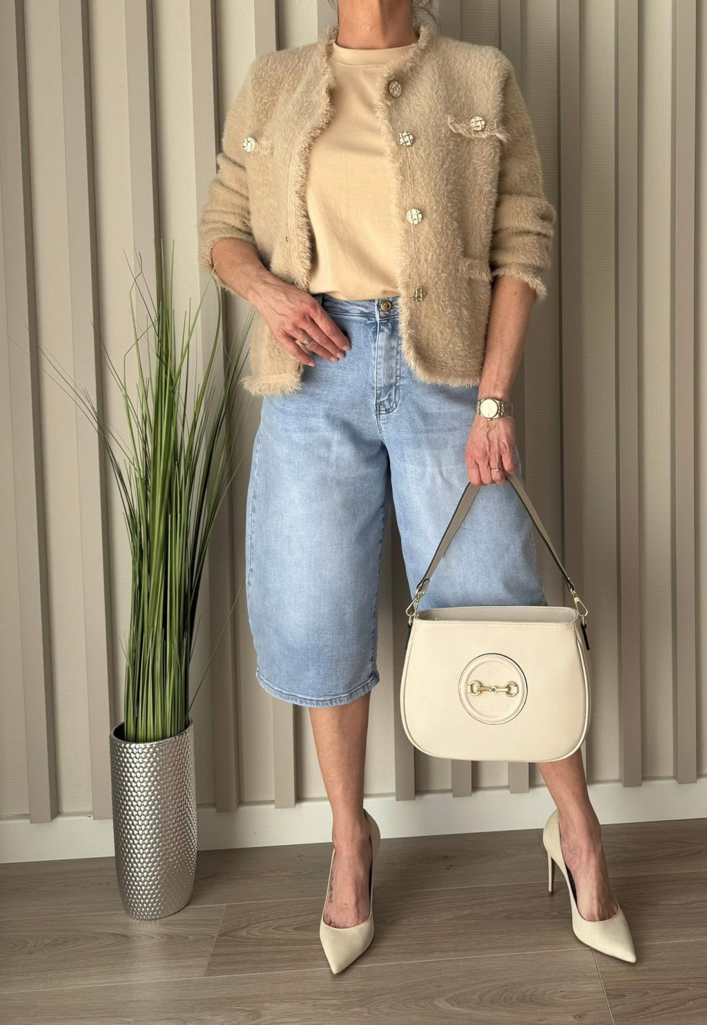 Stílusos és kényelmes választás a melegebb napokra ez a világoskék farmer bermuda nadrág. Magas derekú kialakítása szépen formálja az alakot, míg térdig érő szabása elegáns, mégis laza megjelenést biztosít. Könnyen kombinálható basic felsőkkel és csinosabb darabokkal is, így tökéletes választás hétköznapi és alkalmi szettekhez egyaránt.