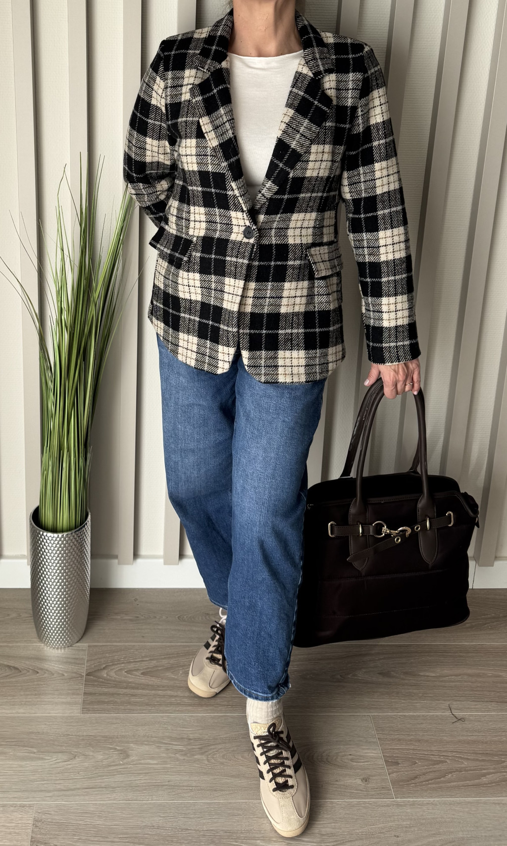 ???? Kockás gyapjúhatású blézer – bézs-fekete női zakó kabát