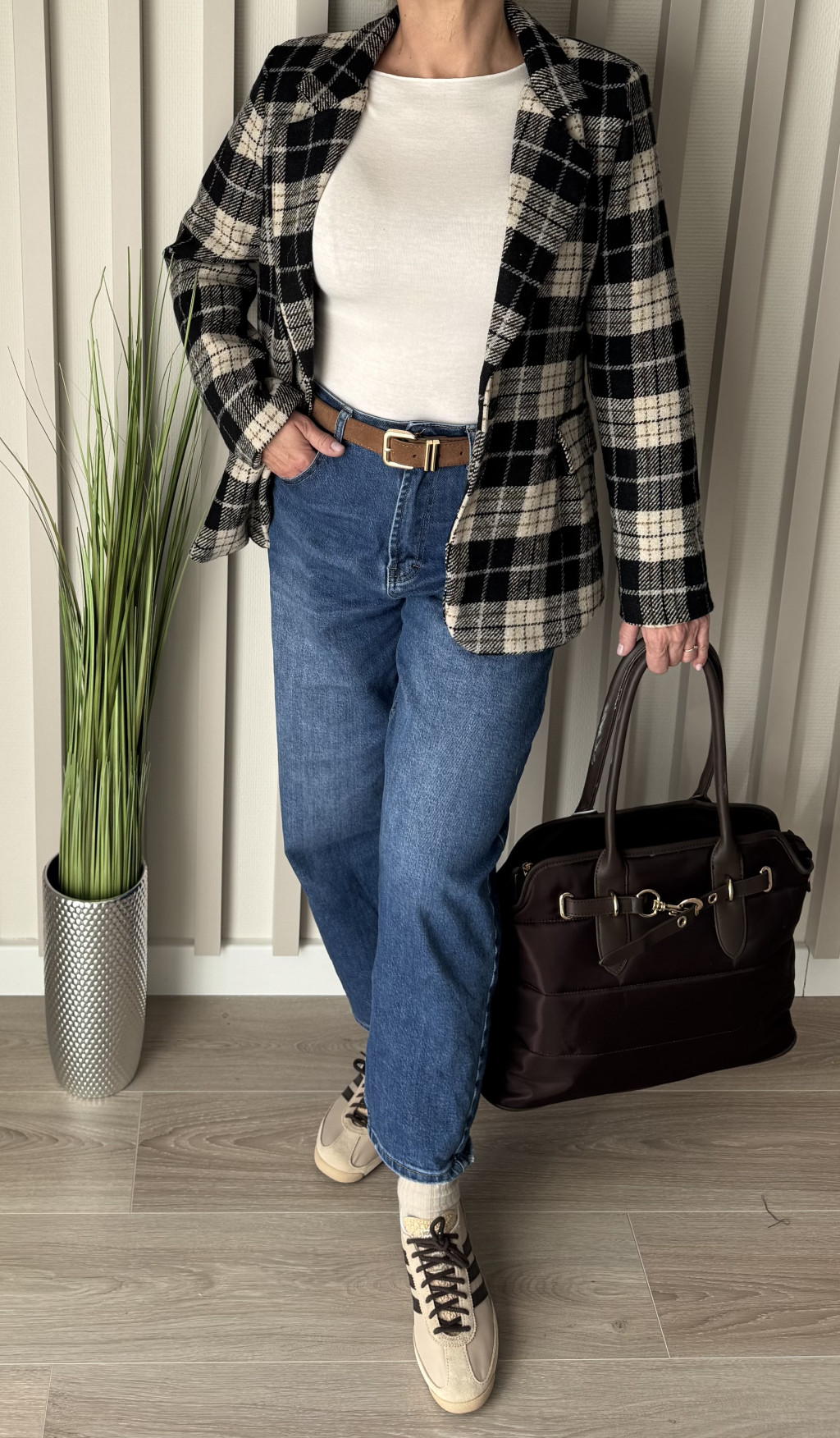 Stílusos, elegáns és mégis lezser – ez a bézs-fekete kockás blézer tökéletes választás a hűvösebb napokra. Közepesen vastag, gyapjúhatású anyagból készült, amely melegen tart, miközben megőrzi a klasszikus, nőies vonalakat.