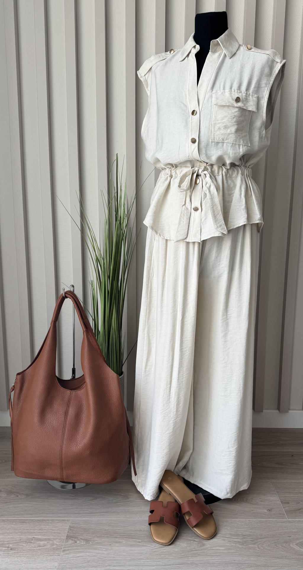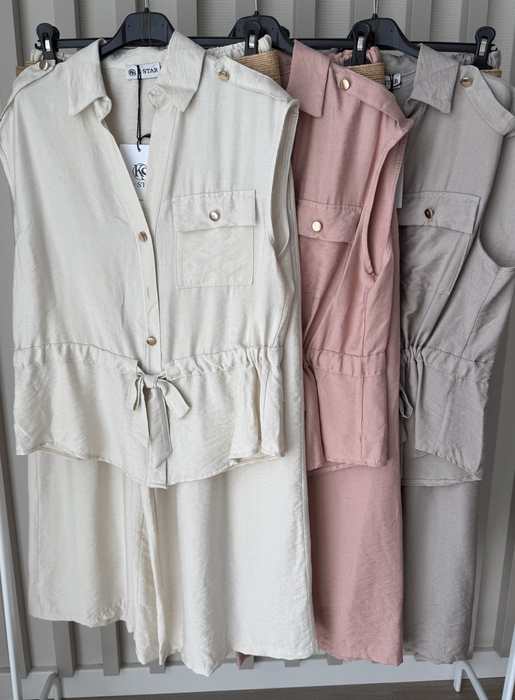 Laza esésű, mégis nőies szabású kétrészes szett, amely kényelmet és stílust kínál a mindennapokra. Az ujjatlan, gombos felső deréknál megköthető övvel hangsúlyozza az alakot, míg a bő szárú nadrág könnyed viseletet biztosít. Tökéletes választás hétköznapi elegáns megjelenéshez vagy nyári programokhoz.